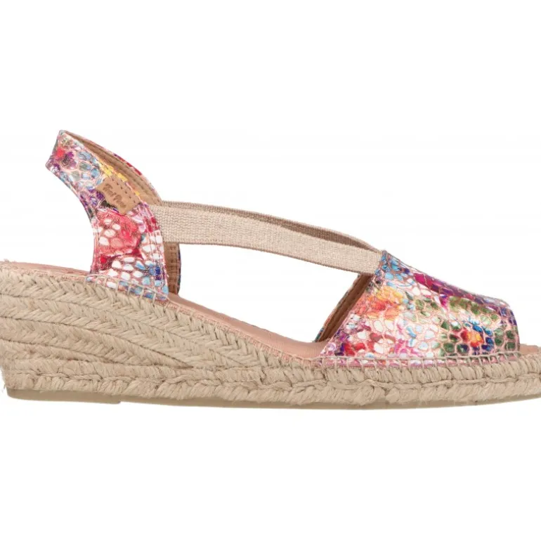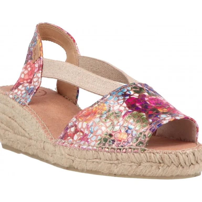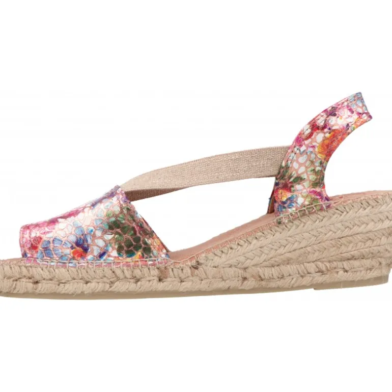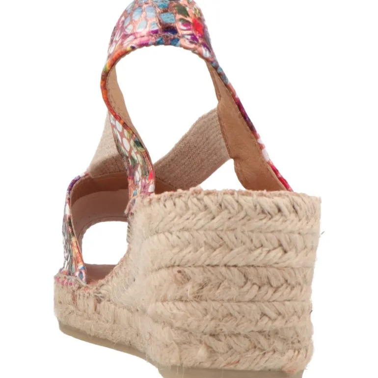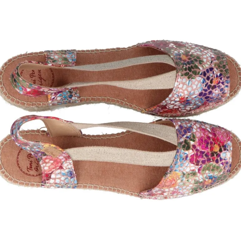 - Sandalias con base de yute y hechas de piel con estampado multicolor en acabado brillante